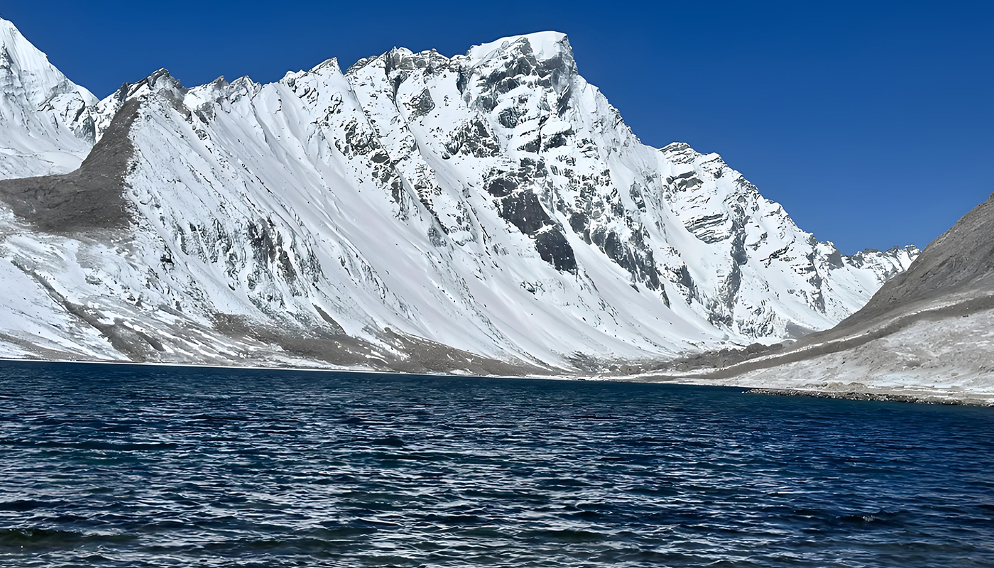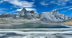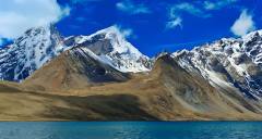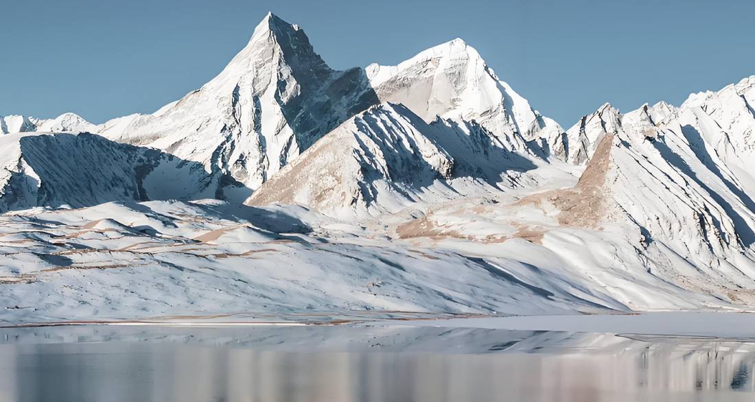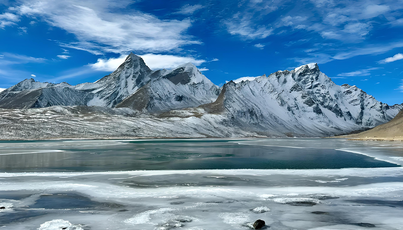 Dinggyê Tsomtso Lake is an undeveloped alpine lake nestled on the northern slopes of the Himalayas in Dinggyê County, Shigatse, Tibet, at an altitude of approximately 4,800–4,932 meters. The gourd-shaped lake lies at the foot of the 6,669-meter-high Ama Drime Snow Mountain, creating a stunning reflection of the snow-capped peaks on its surface. The water displays a gradient of colors from emerald green to Tiffany blue under varying light conditions, with the "sunset golden glow" on the mountain being a spectacular sight at dusk. The lakeshore is dotted with prayer flags and mani stones, and occasional wildlife such as Tibetan gazelles and blue sheep can be spotted. The site is free to visit and open 24/7, but requires a 4WD vehicle to navigate the unpaved access road. Visitors must prepare for high-altitude conditions with oxygen supplies and cold-weather gear.