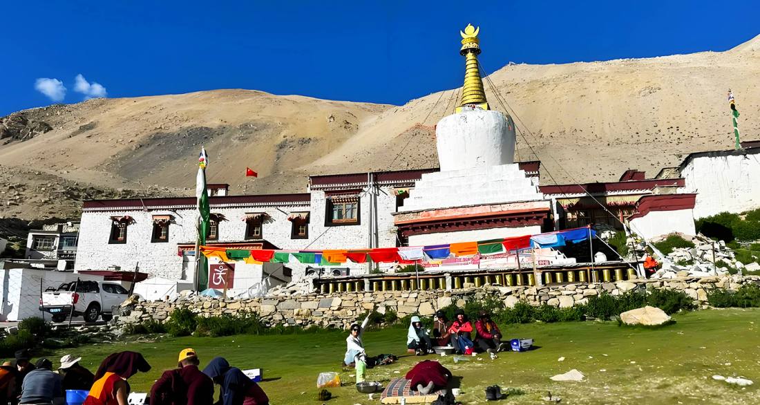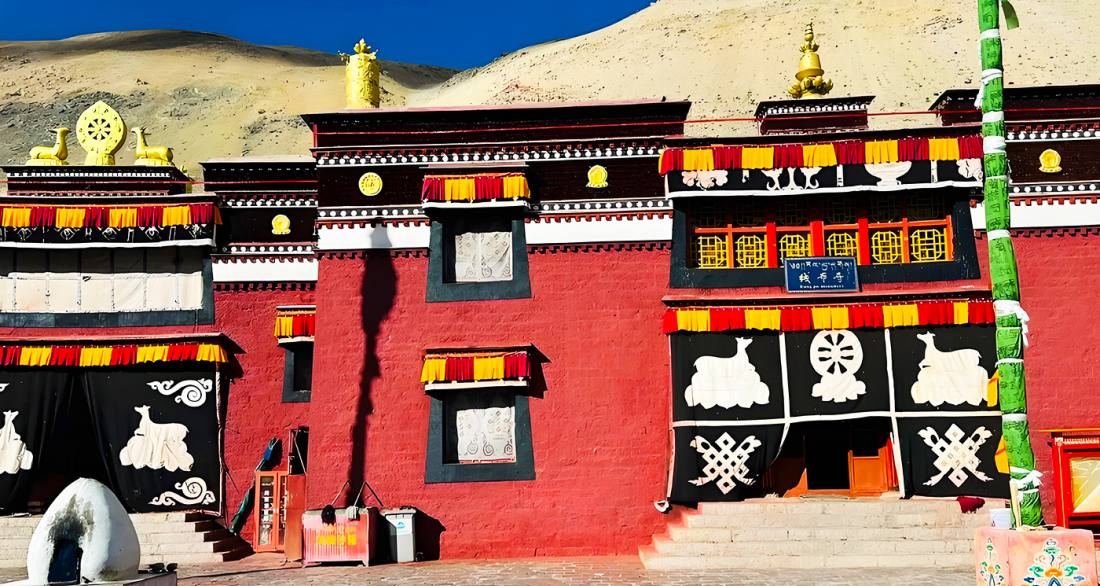 Rongbuk Monastery is situated on the summit of Drolma (Tara) Mountain on the eastern and western sides of the Rongbuk Valley in Tingri County, Xigazê City, Tibet, at an altitude of approximately 5,154 meters, making it the highest temple in the world. Founded in 1899 by the Red Sect lama Agwang Danzeng Luobu, it belongs to the Nyingma sect of Tibetan Buddhism and is a unique mixed-gender monastery housing both monks and nuns. The monastery is divided into old and new sections: the old temple preserves sacred sites such as the meditation cave of Padmasambhava and stones imprinted with his hand and footprints, while the new temple offers an exceptional vantage point for viewing Mount Everest, where the mountain's pyramid-shaped peak and the "banner cloud" phenomenon are clearly visible. As a key base camp for the northern ascent of Everest, Rongbuk Monastery embodies both mountaineering culture and Tibetan Buddhist devotion, with its prayer circuit, Cham dance rituals, and valuable murals reflecting profound cultural significance.