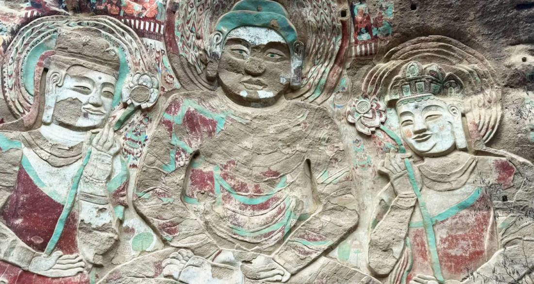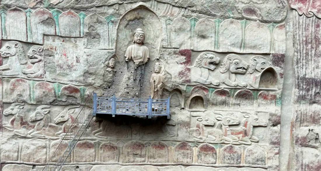 The Water Curtain Cave Grottoes are situated in the Zhongloushan Valley, about 25 kilometers northeast of Wushan County in Tianshui City, Gansu Province. Renowned for their natural caves, cliff carvings, and Buddhist murals, the complex was first established during the Northern Zhou Dynasty. It comprises four main sections: Water Curtain Cave, Lasao Temple, Thousand Buddha Cave, and Xiansheng Pool. The highlight is the 42.3-meter-high open-air cliff relief Buddha at Lasao Temple—the largest of its kind in the world—whose lotus throne is adorned with carved lions, deer, and elephants. Blending Danxia landforms with grotto art, the site is celebrated as the "Pearl of Longshan."