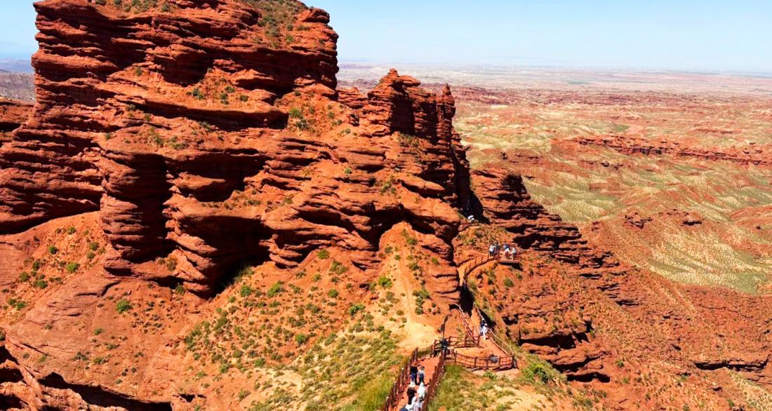 Pingshanhu Grand Canyon is located in Pingshanhu Mongolian Township, Ganzhou District, Zhangye City, Gansu Province, approximately fifty-six kilometers from the city center, and is a National AAAA-level tourist attraction. Its geological structure belongs to the red bed landform, composed of red sandstone and conglomerate formed during the Mesozoic Jurassic to Cenozoic Tertiary periods, with a history spanning hundreds of millions of years, earning it the title “Living Textbook of Geological History”. The canyon integrates Danxia landform, Yardang landform, and canyon wonders, featuring peculiar peak forests, deep ravines, and a dominant color palette of red, white, and ochre. Notable landmarks include “One-Line Sky,” “Nine Dragons Converging Sea,” and “Lovers Peak”. Visitors can choose between standard or in-depth tours to experience hiking, camel riding, and adventure vehicle traversing, immersing themselves in its majestic and desolate natural beauty.