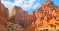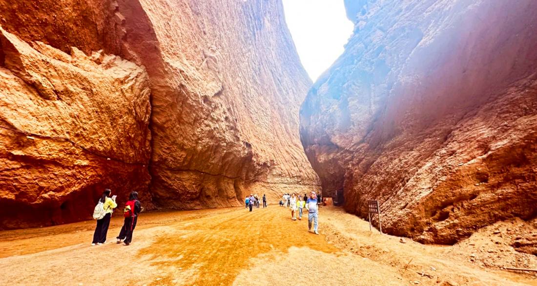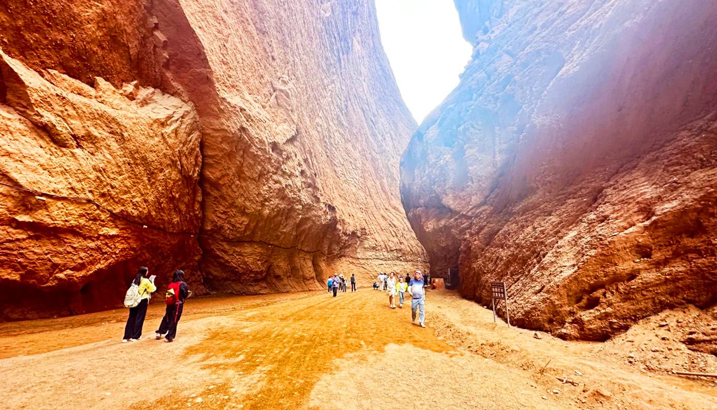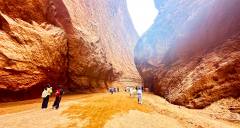 The Tianshan Mysterious Grand Canyon (also known as Kizilia Grand Canyon) is situated approximately 64 kilometers north of Kuqa City in the Aksu region of Xinjiang, along the southern section of the Dushanzi-Kuqa Highway (National Highway G217). It is a typical red sandstone canyon landscape, often referred to as the "Chinese version of Antelope Canyon." The canyon stretches about 5,000 meters in length, comprising a main valley and seven branch valleys. The canyon floor is at its widest 53 meters and narrows to just 0.4 meters at its tightest point, requiring visitors to squeeze through sideways. The average altitude is 1,600 meters, with the highest peak reaching 2,048 meters. Its reddish-brown rock formations date back to the Cretaceous period, 140 million years ago, and have been shaped by eons of wind and water erosion, resulting in layered and interlocking ridges and grooves that display a brilliant rose-gold hue at dawn and dusk. The canyon features numerous natural and cultural attractions, including the Divine Dog Guarding the Valley, the Jade Maiden Spring, and the A'ai Grottoes. It has been listed among "China’s Top Ten Most Beautiful Canyons" and rated as a National AAAA-level Tourist Attraction. Visitors should note the canyon’s dry and hot conditions, requiring ample water and sun protection. An evening visit is recommended to experience the captivating play of light and shadow, and entry should be avoided during the rainy season to prevent sudden flash floods.