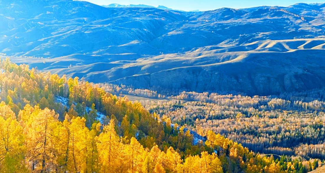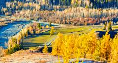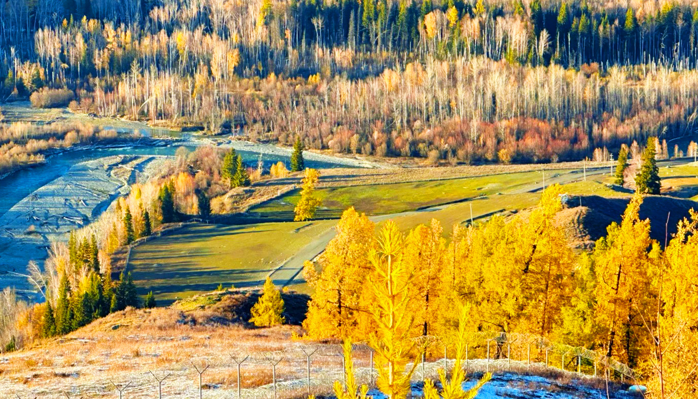 The China-Kazakhstan Border Grand Canyon (also known as Tielieketi Grand Canyon) is situated at the border between Habahe County and Burqin County in the Altay Prefecture of China's Xinjiang, right on the border between China and Kazakhstan, with the Akehaba River (Baihaba River) serving as the boundary river. The most striking feature of the canyon is the stark contrast between its two sides: the Chinese side is lush with dense forests (especially birch forests), while the Kazakh side often appears barren. Autumn (mid-to-late September to early October) is the most beautiful season, when the birch forests in the river valley turn golden, creating a spectacular colorful picture together with the turquoise river and snow-capped mountains. Viewing platforms are set up in the canyon for overlooking the entire landscape, offering distant views of the snow mountains, grasslands, and border lookout towers in Kazakhstan. The famous China-Kazakhstan Border Marker No. 5 is also located here. The canyon is a must-pass route on the way to Baihaba Village, approximately eleven kilometers from the village. It is generally free to visit, but a border permit is required in advance.
