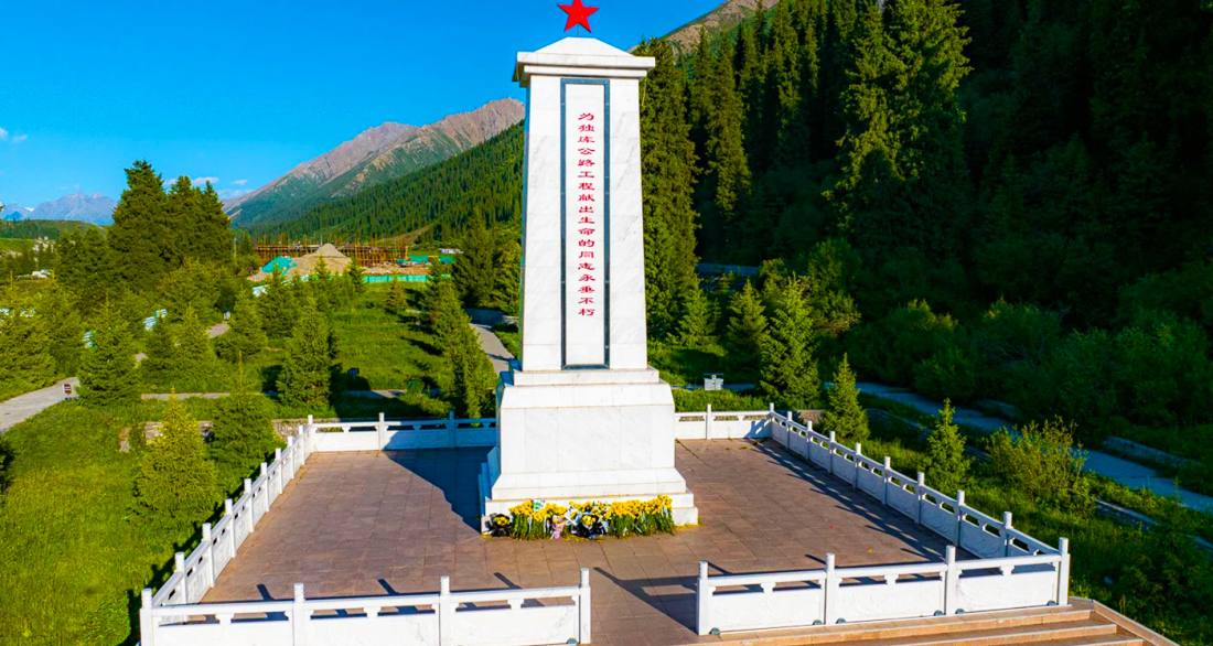 喬爾瑪烈士陵園位於新疆伊犁哈薩克自治州尼勒克縣獨庫公路與S315省道交匯處,是為紀念修建天山獨庫公路時犧牲的解放軍官兵而建的國家級革命烈士陵園。陵園由漢白玉紀念碑、烈士墓塚和天山獨庫公路紀念館組成。紀念碑正面鐫刻「為獨庫公路工程獻出生命的同志永垂不朽」,背面銘刻烈士姓名與築路史蹟。紀念館內陳列築路工具、照片等實物,生動展現官兵在極端惡劣環境中開鑿天險的艱辛歷程。陵園自建成後,經多次修繕擴建,已成為自治區級烈士紀念設施、愛國主義教育基地,每年吸引大量參觀者。尤為感人的是老兵陳俊貴自起自願守護陵園四十餘載,其事蹟被改編為電影《守望天山》,使「天山精神」跨越時空傳承不息。